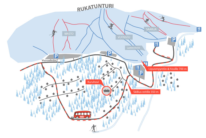 Ski-Bussille 200 m (lähin pysäkki alemmalla kadulla Vuosselinrinteellä, tarkista aikataulut, Rukan alueella kyyti on ilmainen),
